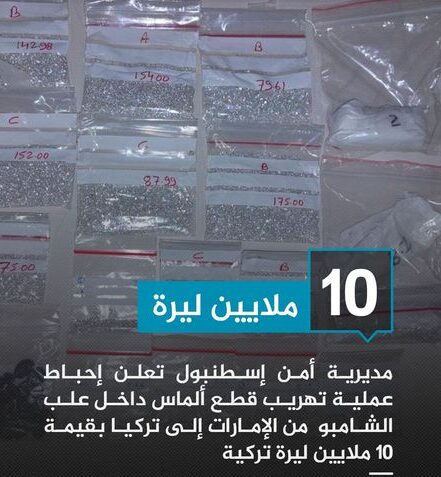 مديرية أمن إسطنبول تعلن مصادرة ألماس بقيمة 10 ملايين ليرة، أثناء محاولة مواطن إيراني الجنسية تهريبها في رحلة قادمة من الإمارات إلى تركيا، عبر مطار صبيحة غوكتشن