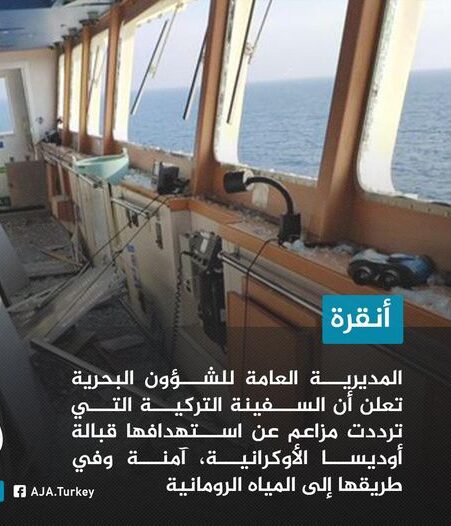 المديرية العامة للشؤون البحرية التركية: تواصلنا مع سفينة “ياسا جوبيتر” التركية، وهي آمنة وفي طريقها إلى المياه الإقليمية الرومانية، ولم تحدث خسائر في الأرواح بين طاقم السفينة