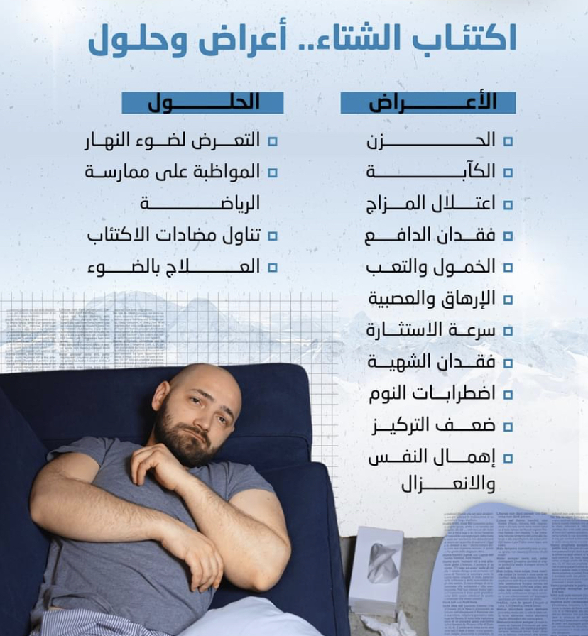 اكتئاب الشتاء يندرج ضمن الاضطرابات العاطفية الموسمية، وتكمن أسبابه في الأجواء الكئيبة المهيمنة على هذا الوقت من العام والمتمثلة في الظلام والغيوم وهطول الأمطار وقصر النهار.