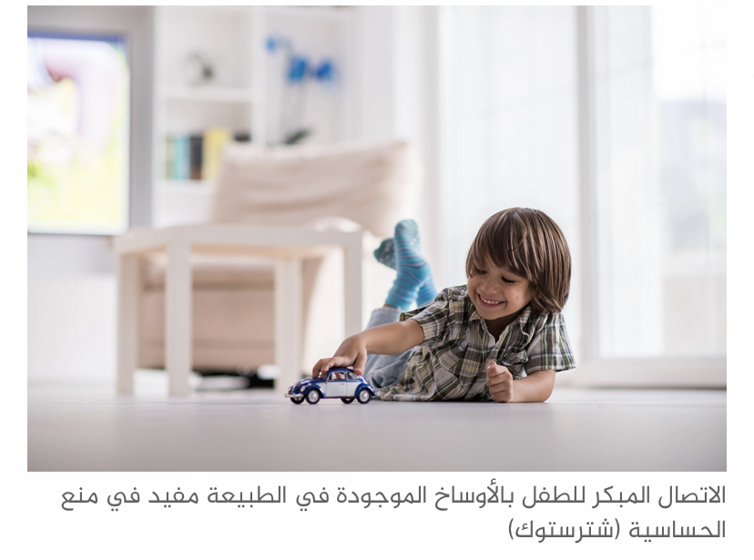 وحسب الدراسات الحالية، فإن الاتصال المبكر للإنسان بالأوساخ الموجودة في الطبيعة مع الأطفال الآخرين والحيوانات مفيد في منع الحساسية، لهذا قد يتمتع الأطفال الذين يُسمح لهم باللعب وسط الرمل والأتربة وأوراق الأشجار والمحاطين بالكلاب مثلا بصحة جيدة.