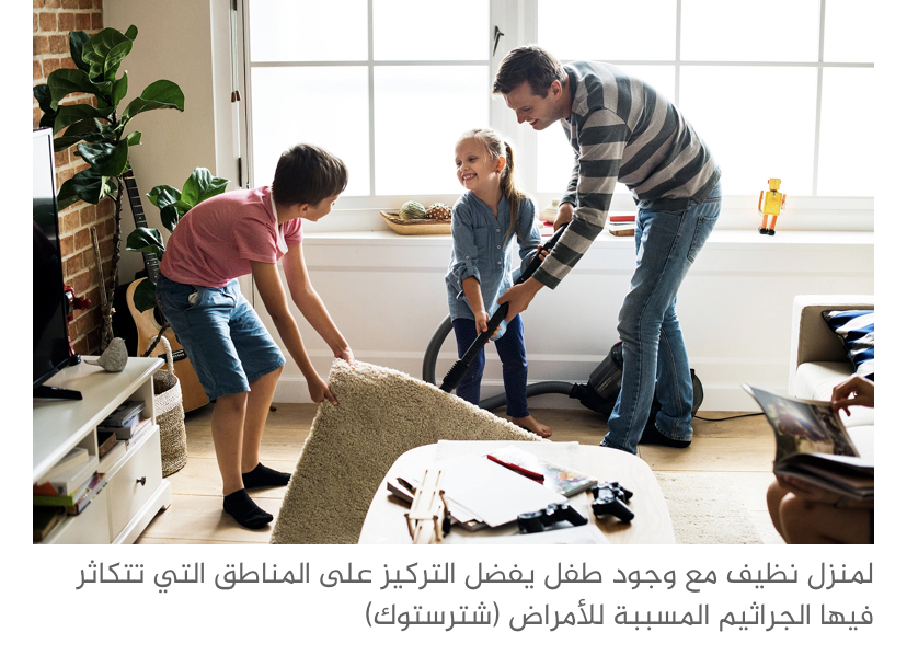 عند إصابة أحد أفراد الأسرة بمرض معدٍ مثل نزلات البرد أو غيرها ينصح برمي المنديل مباشرة بعد تنظيف الأنف وغسل أو تطهير اليدين وكذلك مقبض باب الحمام، وغسل اليدين قبل ملامسة الطعام في حالة مسببات الأمراض المعدية المعوية، وكذلك تنظيف وتطهير منطقة المرحاض بمطهرات مناسبة ضد الفيروسات، بالإضافة إلى التهوية وارتداء الكمامات.