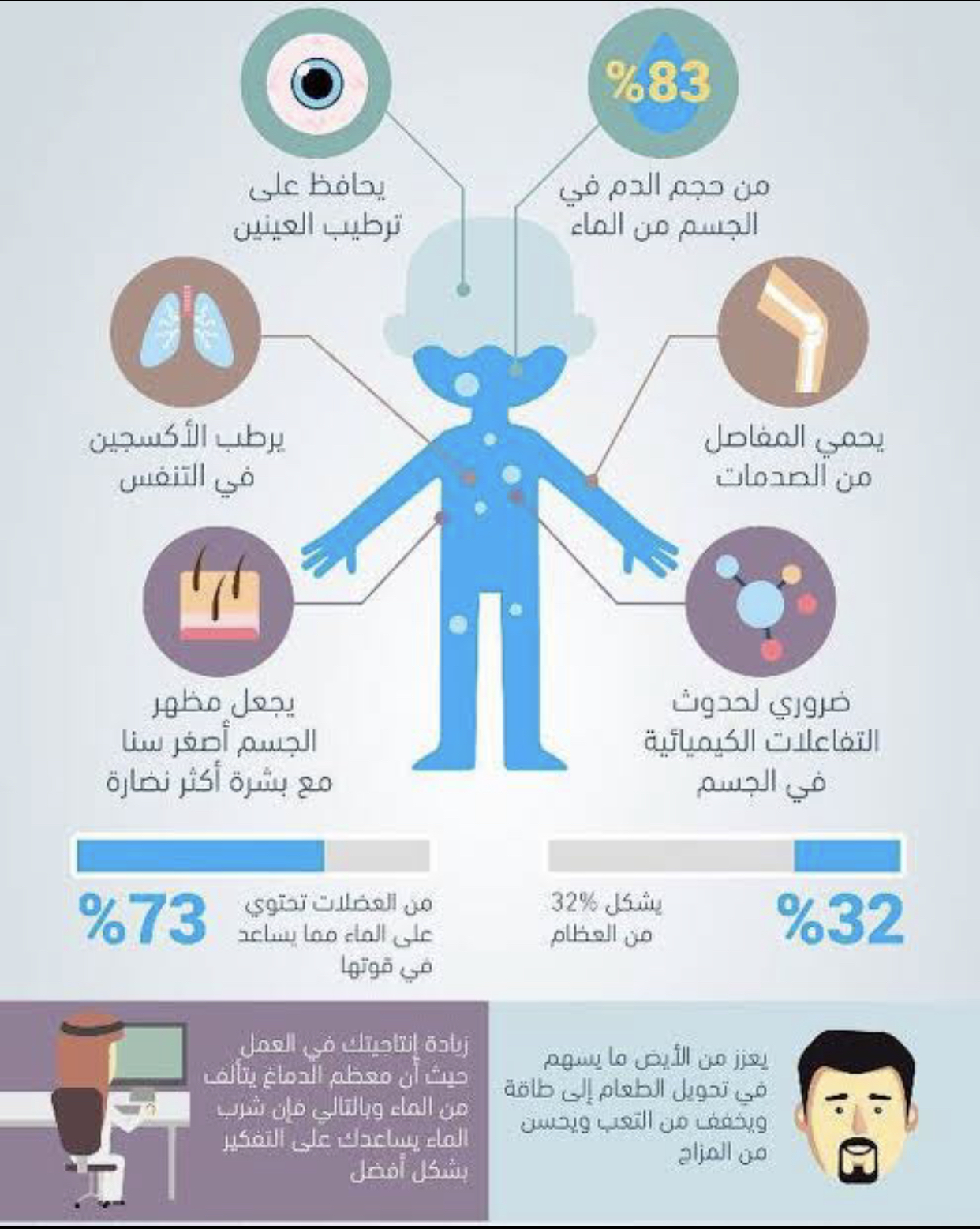 يشكل الماء حوالي 80% من تكوين الغضاريف في المفاصل، لذا قد يؤدي عدم شرب الماء على المدى البعيد إلى التقليل من قدرة المفاصل على تحمل كتلة الجسم والمعاناة من آلام فيها، وفق ما ذكر موقع «ويب طب».