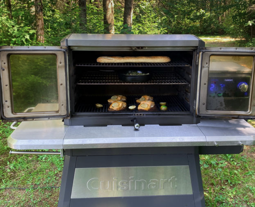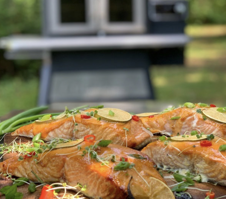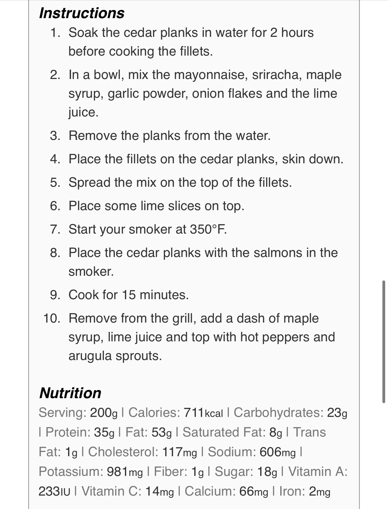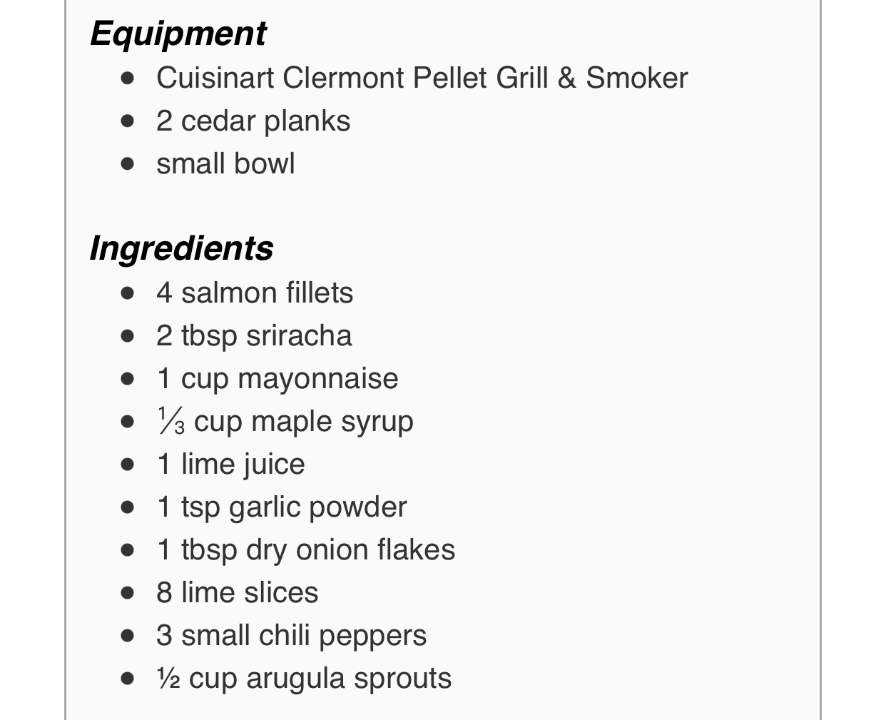 Basted with a sriracha, lime, and maple syrup mayonnaise, these salmon fillets are smoked on a cedar plank in my Cuisinart Clermont Pellet Grill & Smoker at 350F for 15 minutes for a perfect tender and flaky result. Add some chopped chili peppers and some fresh arugula sprouts before serving and you will have a five-star worthy dish in the comfort of your backyard.